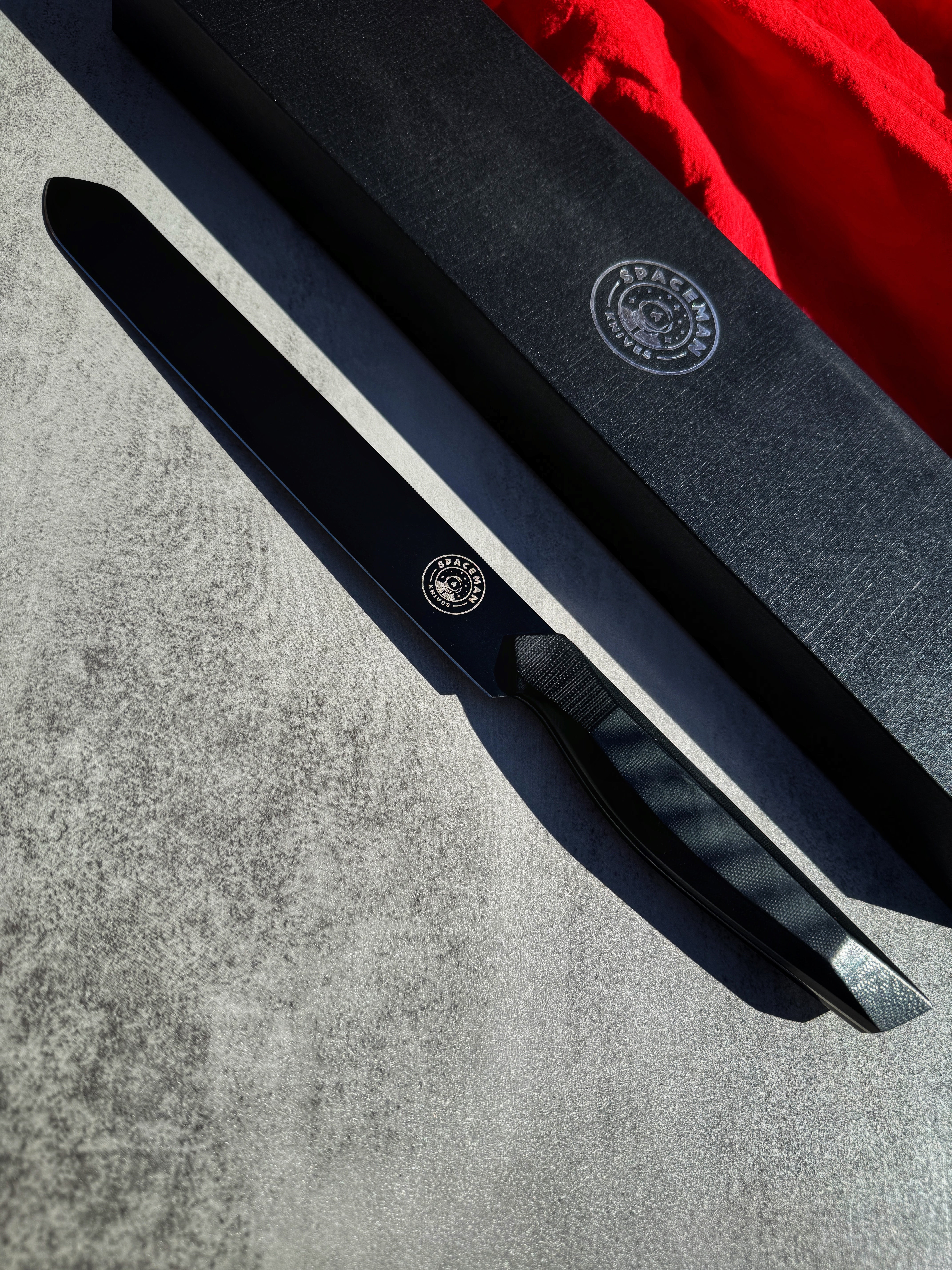 Introducing the Dark Matter Kiritsuke by Spaceman Knives - where cutting-edge design meets exceptional craftsmanship. Crafted from high-performance 7CR17MOV-X steel and finished with a sleek black nitrate coating, this knife is more than just a kitchen tool; it's a work of art.